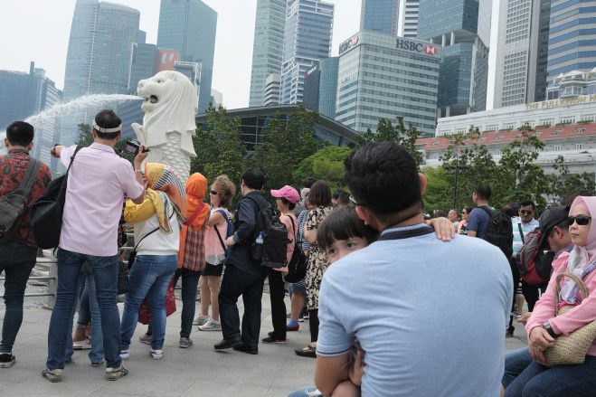 Merlion, Singapore A girl in her father’s arms among the crowd surrounding the Merlion in Singapore. Like Loading... Related