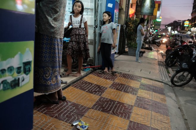 On the sidewalk, Battambang, Cambodia People out on the sidewalk as night falls on Battambang, Cambodia.