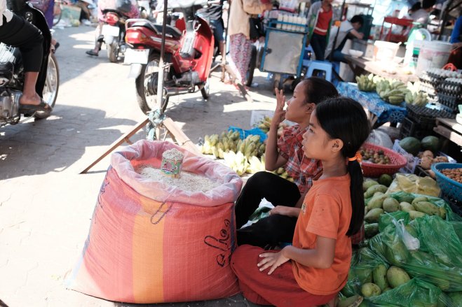 Two girls at a produce stand in Kampong Chhnang, Cambodia.