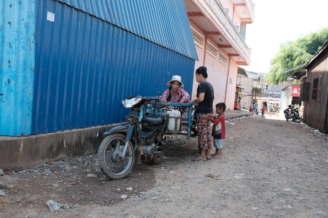 A girl carrying a bucket walking down the street in Kampong Chhnang, Cambodia.