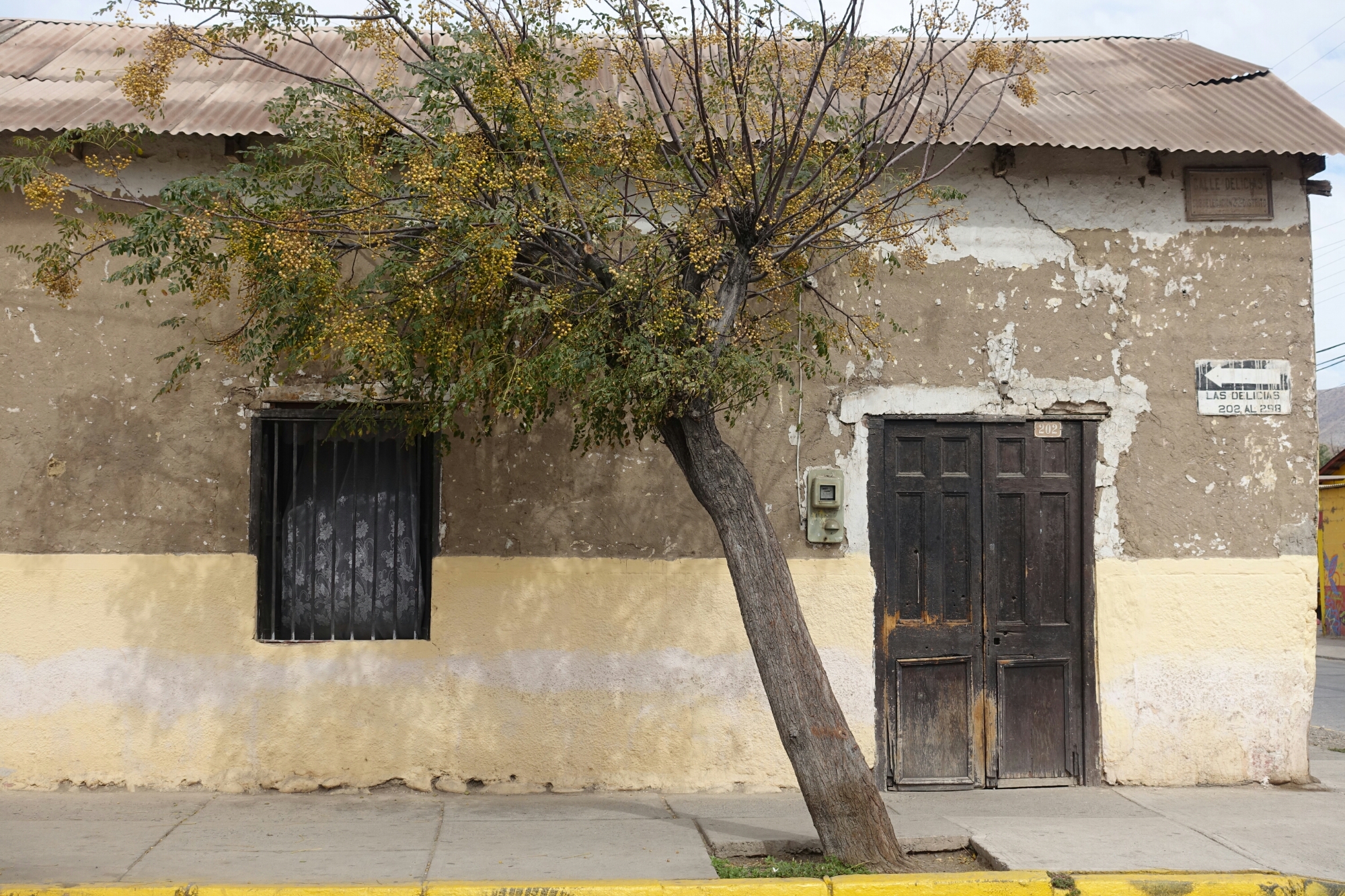 House and leaning tree, Vicuña, Chile A house along a quiet street in the small town of Vicuña, Chile.