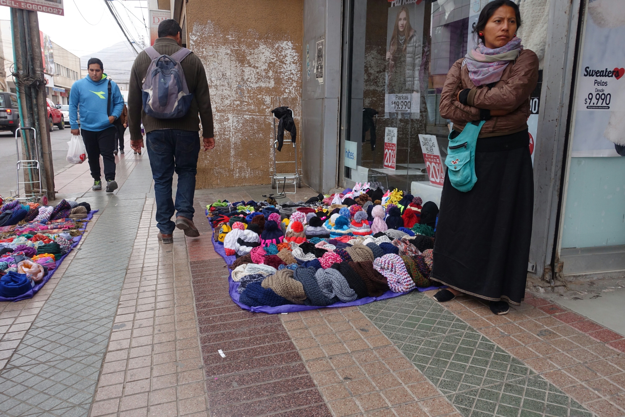 Hats and scarves, Copiapó, Chile A lady with hats and scarves for sale in front of a clothing store in Copiapó, Chile.