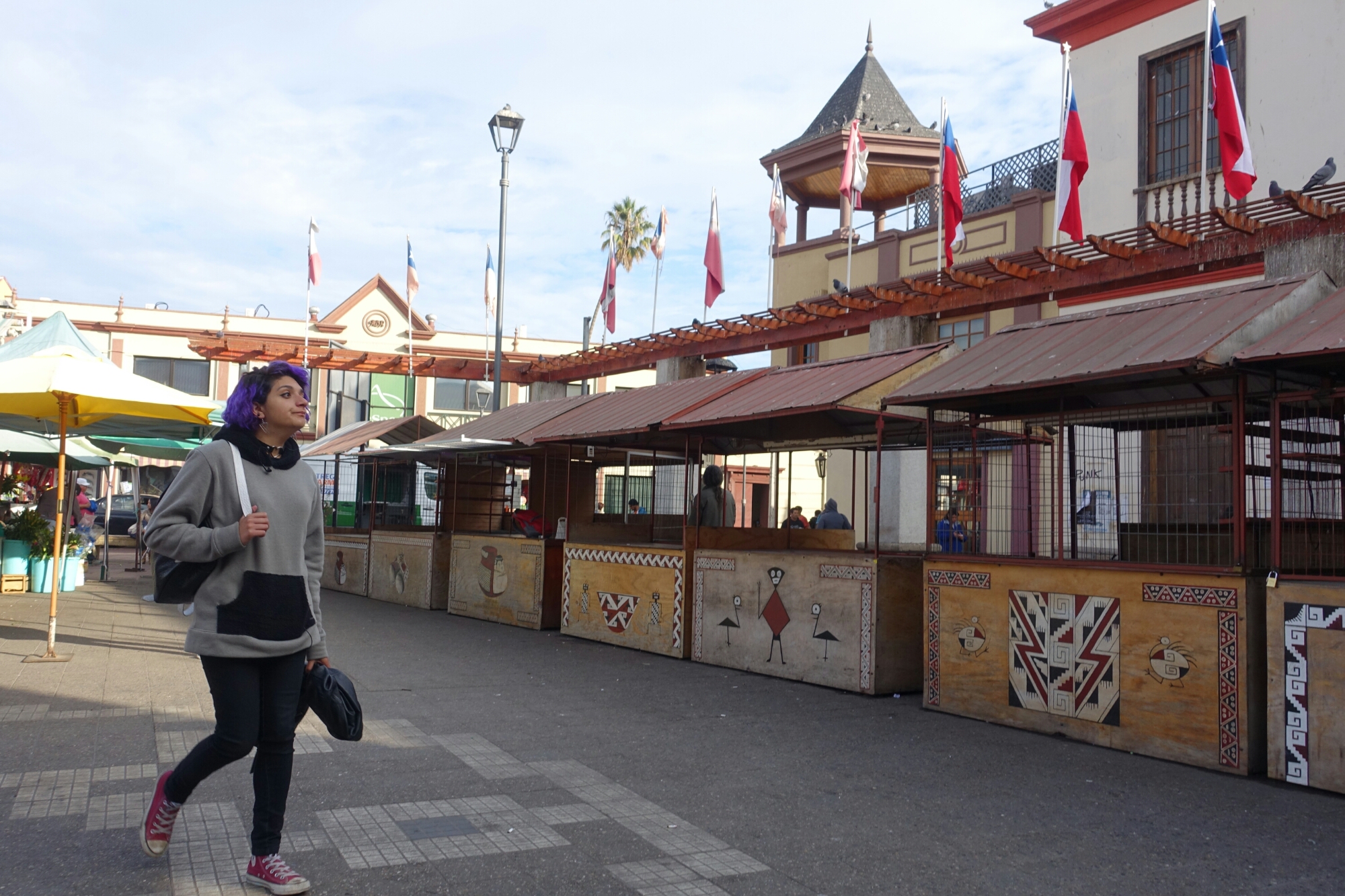 Girl with purple hair, La Serena, Chile A girl with purple hair walks past some empty stalls in front of La Recova, a local crafts market in La Serena, Chile.