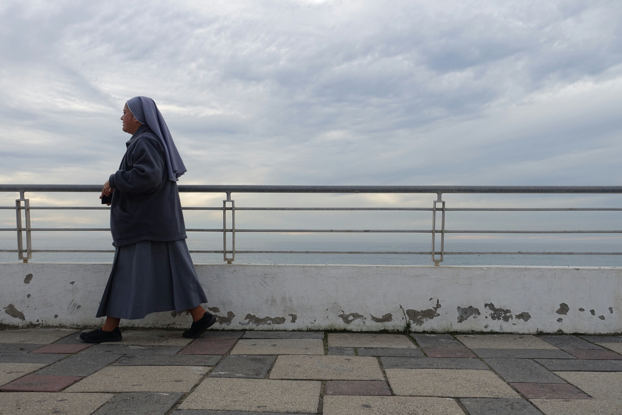 Seaside stroll, Viña del Mar, Chile A nun walks along the promenade by the beach in Viña del Mar, Chile.