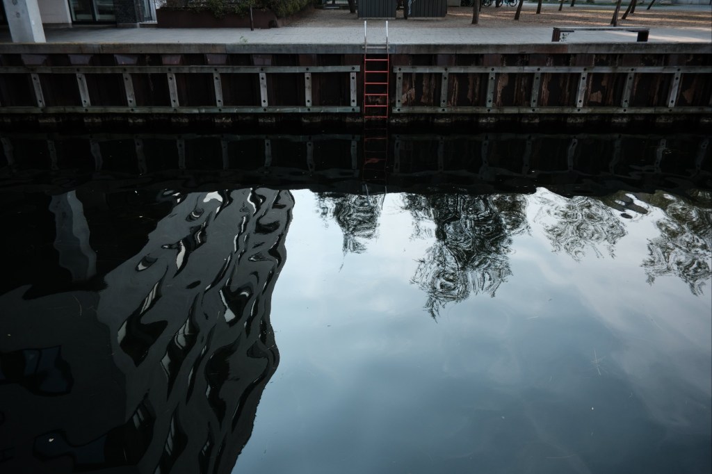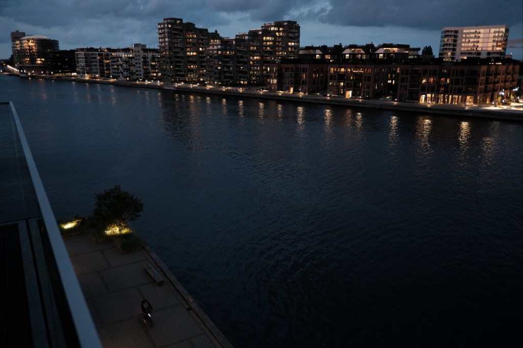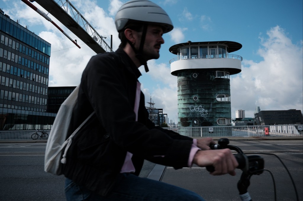 A bicyclist riding along Sydhavnen in Copenhagen, Denmark.