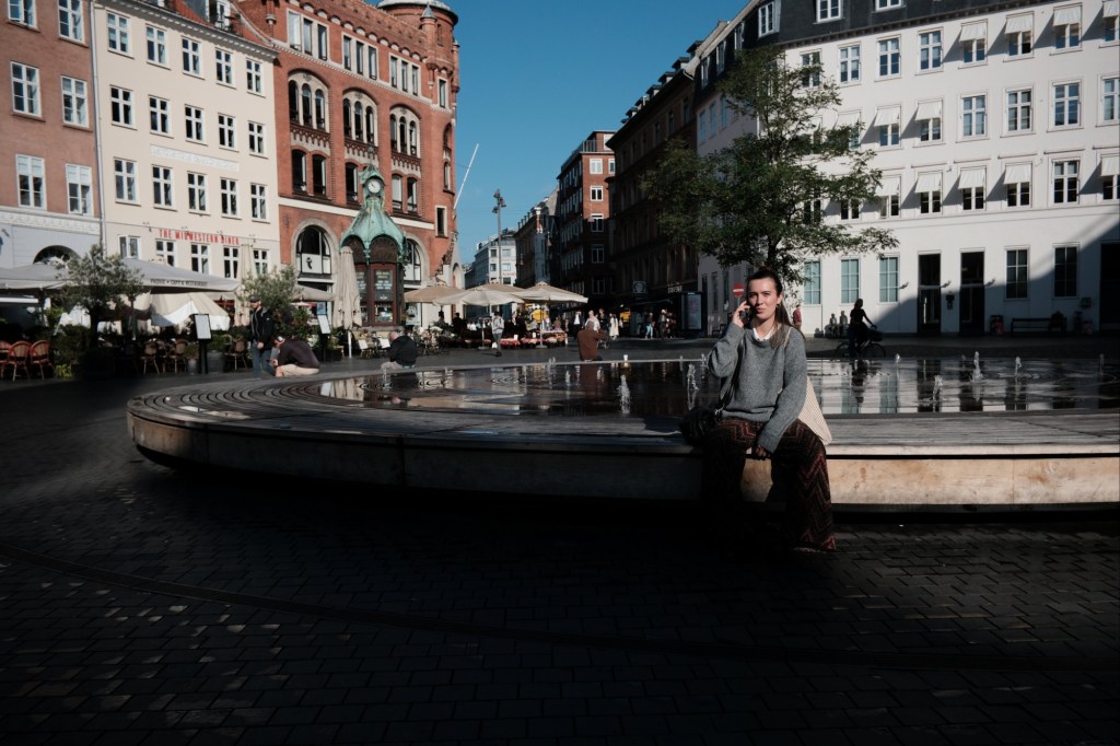 A woman sitting by a fountain in Copenhagen, Denmark.