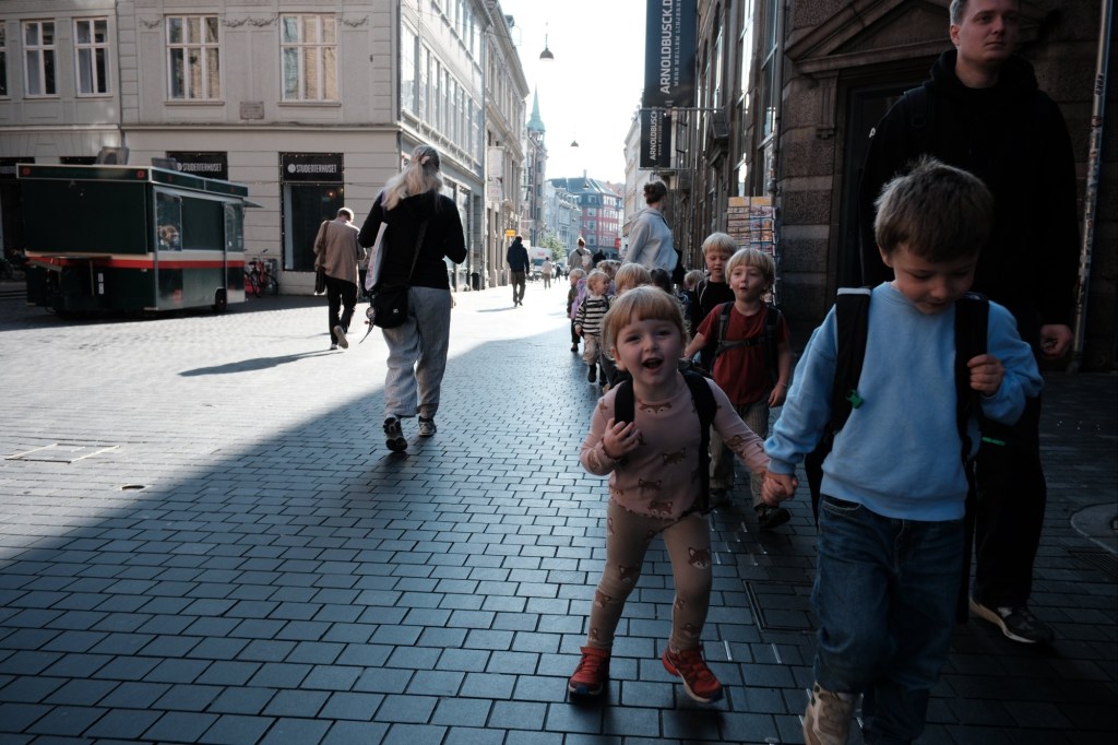 A girl holding hands with a classmate in Copenhagen, Denmark.