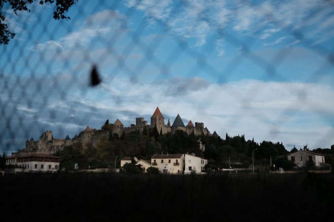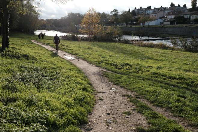 Île et les bords d’Aude, Carcassonne, France People walking across the Île et les bords d’Aude in Carcassonne, France.