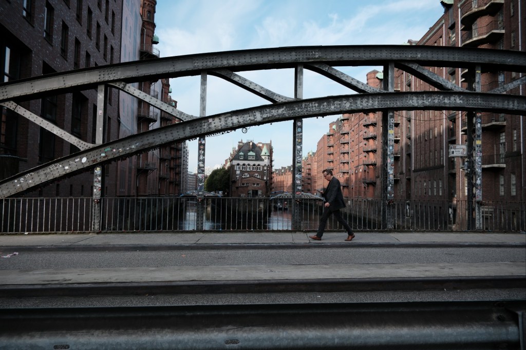 A man walks across a bridge in Speicherstadt, Hamburg, Germany.