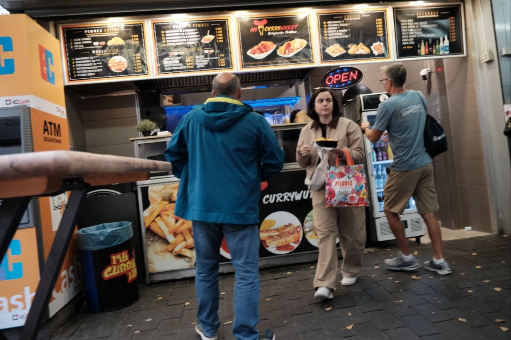 People at a currywurst stand in Cologne, Germany.
