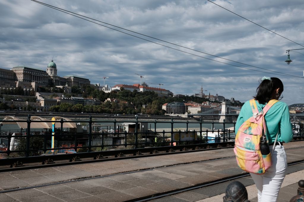 A girl at a tram stop across the Danube from Buda Castle in Budapest, Hungary.