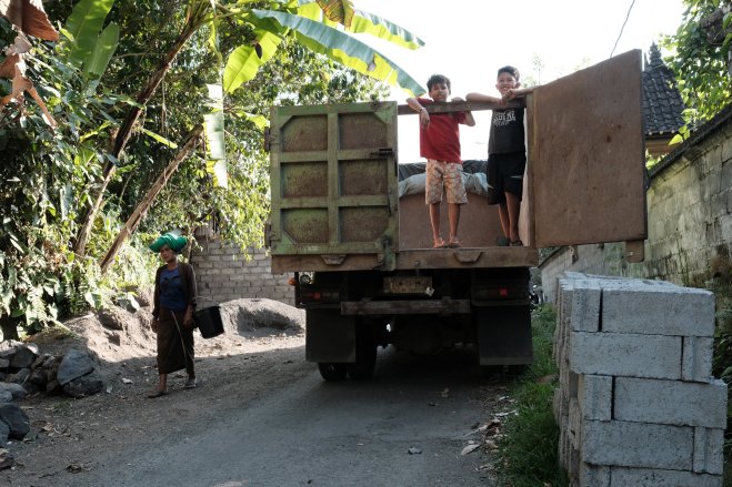 Two boys hanging out in the back of a truck, in Sidemen, Indonesia.