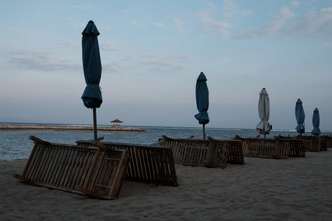 Umbrellas and lounge chairs put away after a day at the beach, in Sanur, Indonesia.