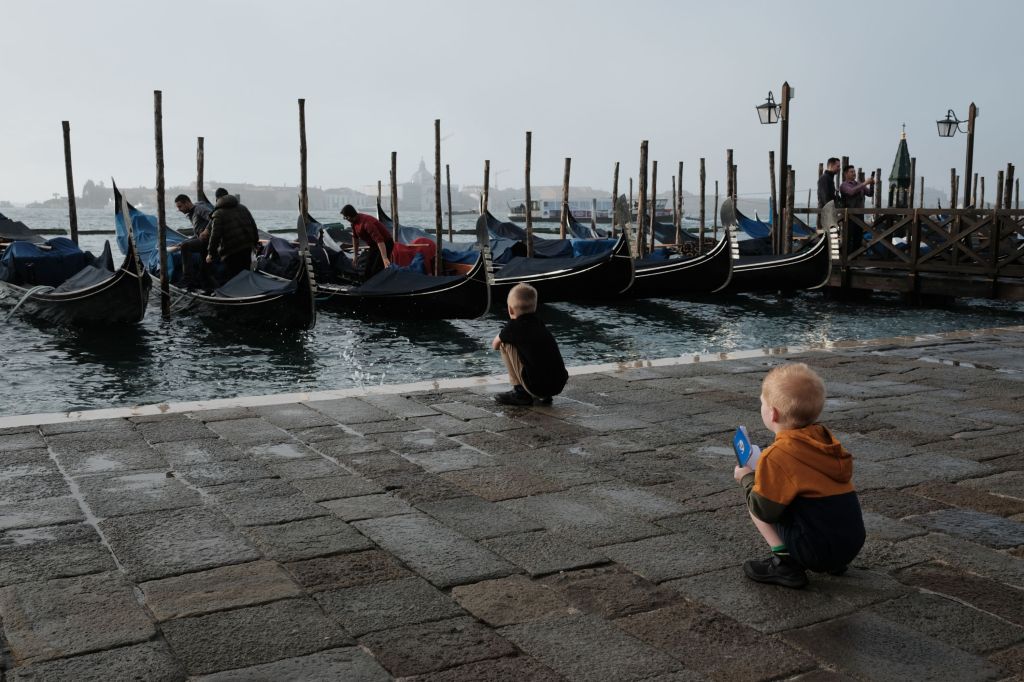 Two boys watching gondoliers at work in Venice, Italy.