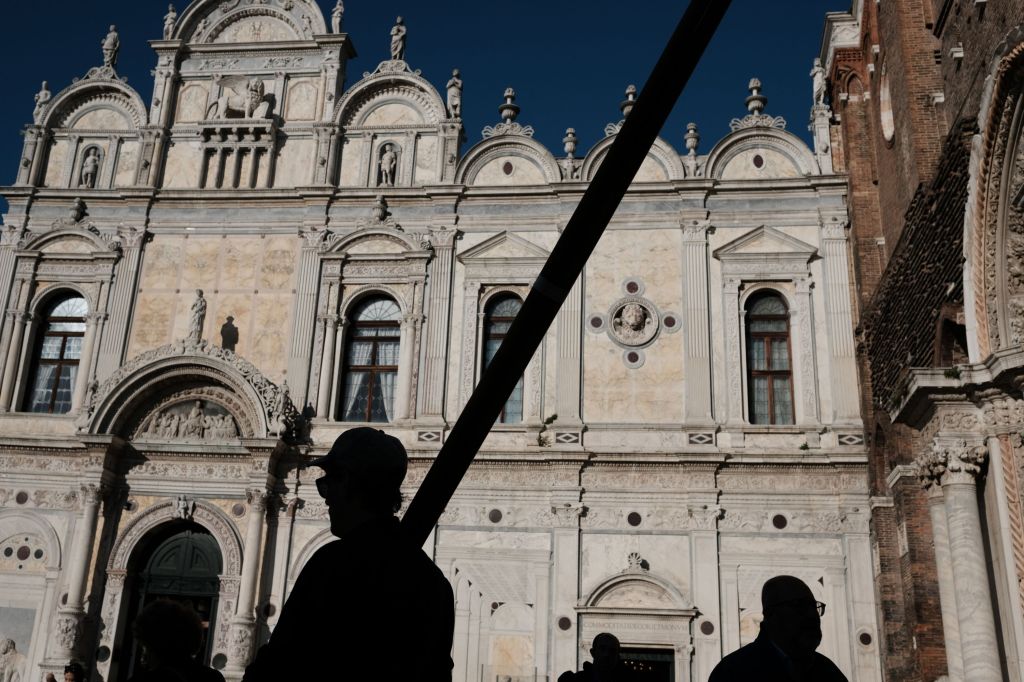 A man carrying a gondola oar walks through the streets of Venice, Italy.