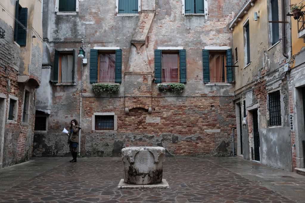 A woman in a courtyard in Venice, Italy.