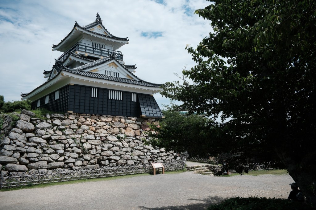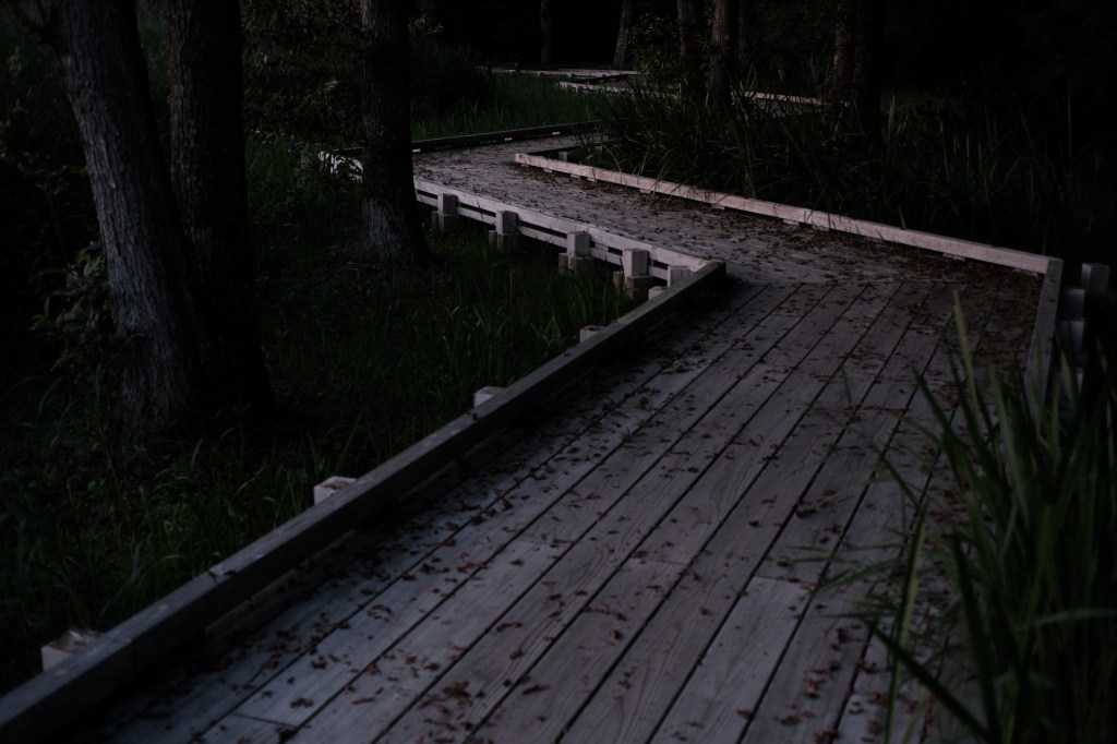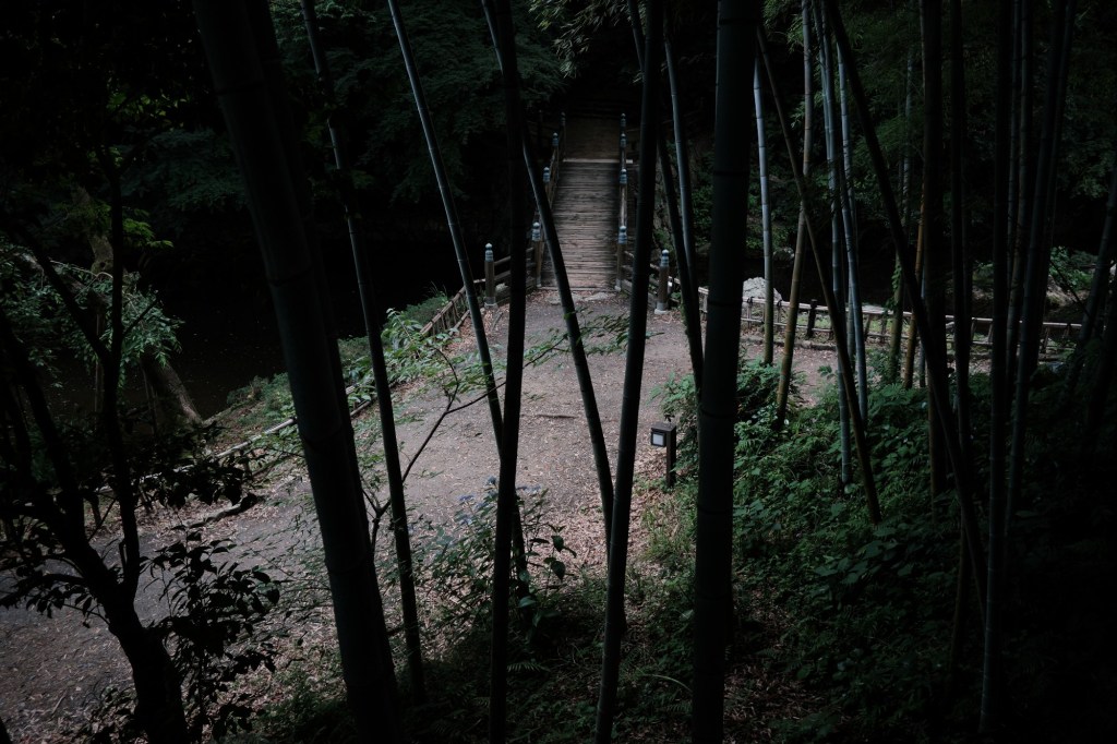 A bridge and bamboo forest at the Hamamatsu Castle Park Japanese Garden in Hamamatsu, Japan.