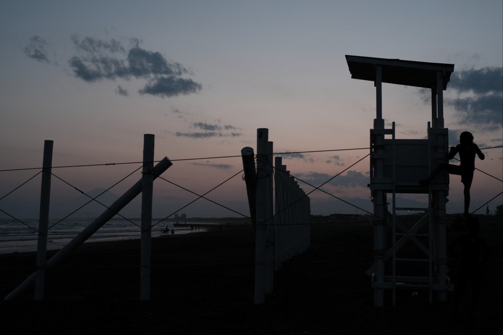 A boy climbs onto a lifeguard post in Fujisawa, Japan.