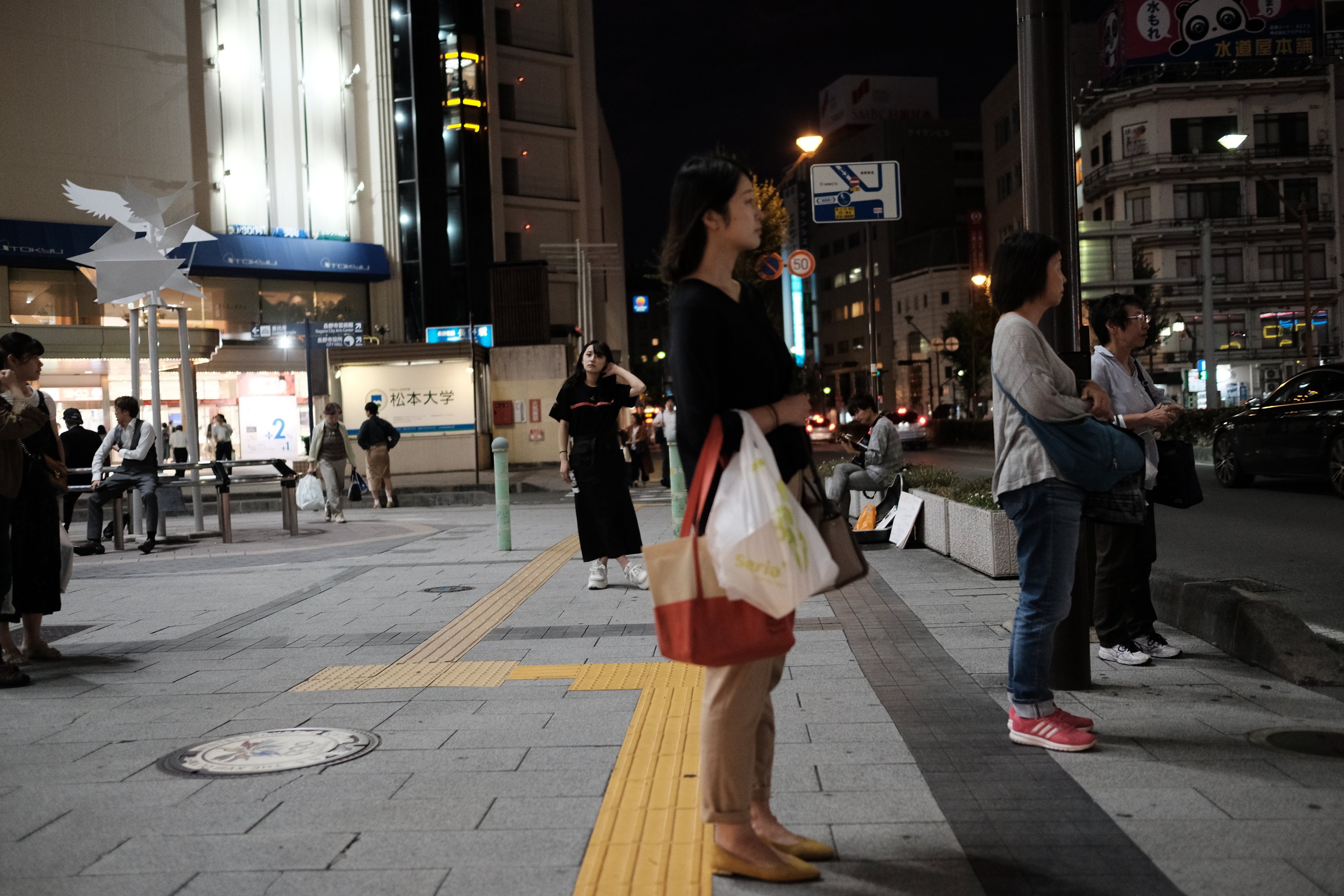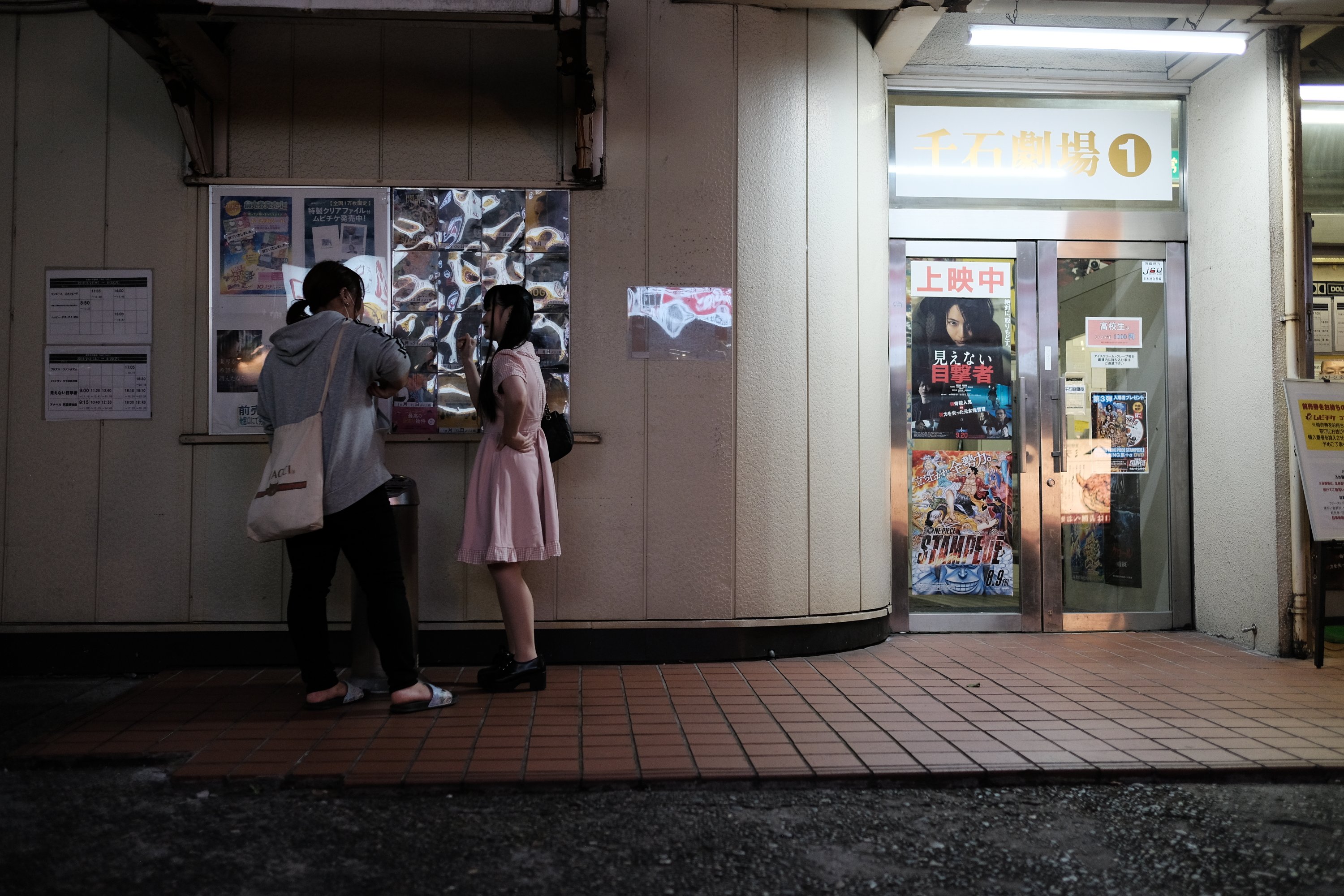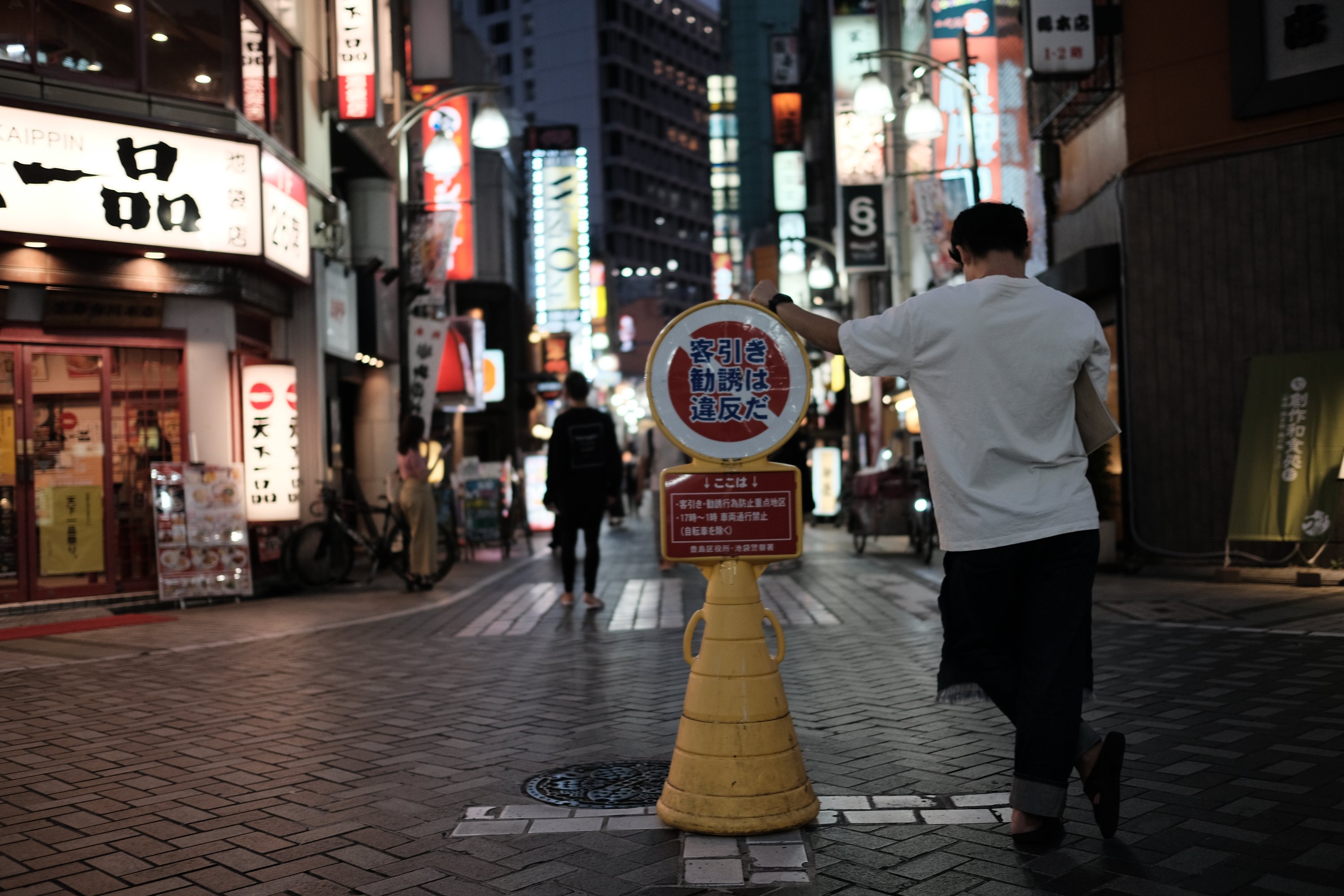 Man walking through torii, Fukuoka, Japan A man walking through the torii at Sumiyoshi-jinja in Fukuoka, Japan.