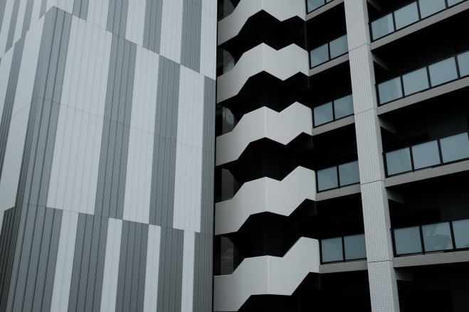 Stairwell between buildings, Kitakyūshū, Japan A stairwell between two buildings in Kitakyūshū, Japan.