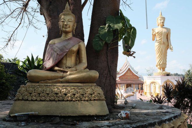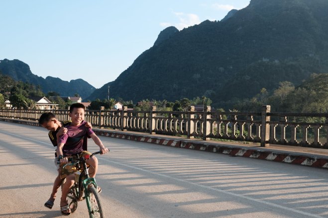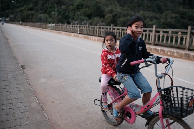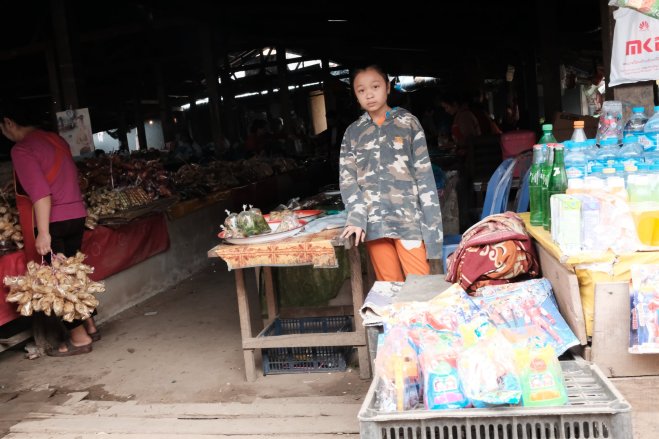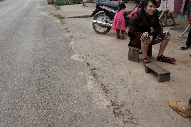 Girl sitting on sidewalk, Nong Khiaw, Laos A girl sitting on a bench on the sidewalk in Nong Khiaw, Laos.