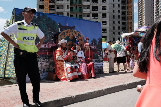 Family posing for photo, Ulaanbaatar, Mongolia A family poses for a photograph at Naadam in Ulaanbaatar, Mongolia.