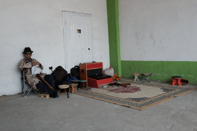Man sitting by knuckle bone shooting table, Ulaanbaatar, Mongolia A man sits by a knuckle bone shooting table at Naadam in Ulaanbaatar, Mongolia.