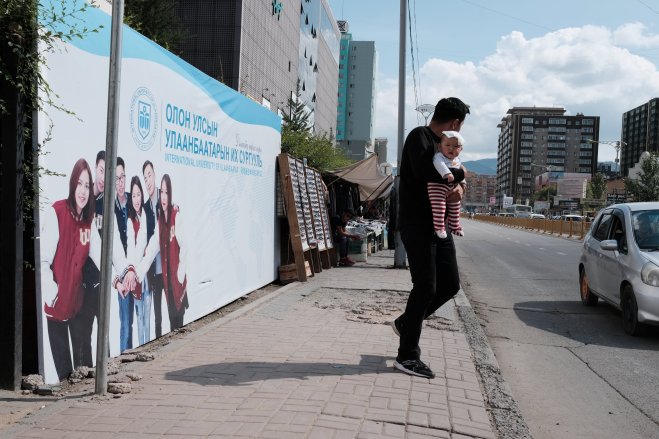 A man carrying a baby crosses the street in Ulaanbaatar, Mongolia.