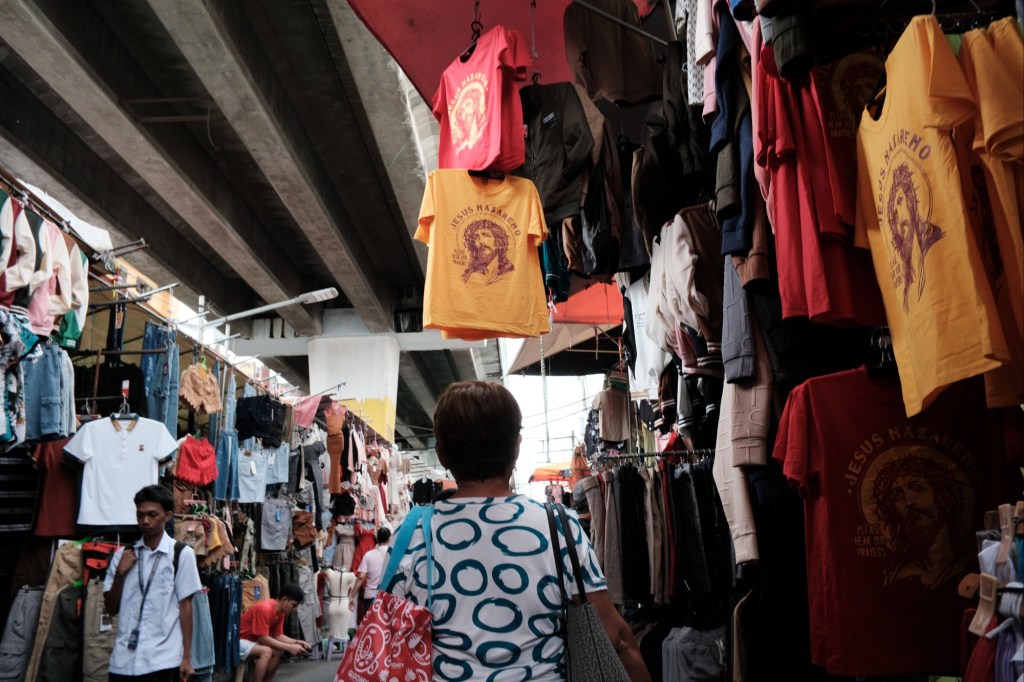 A woman walks under t-shirts hanging in the street in Manila, Philippines.