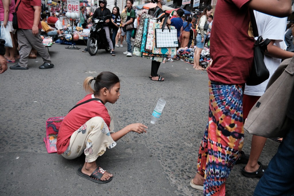 A girl tossing a water bottle in Manila, Philippines.