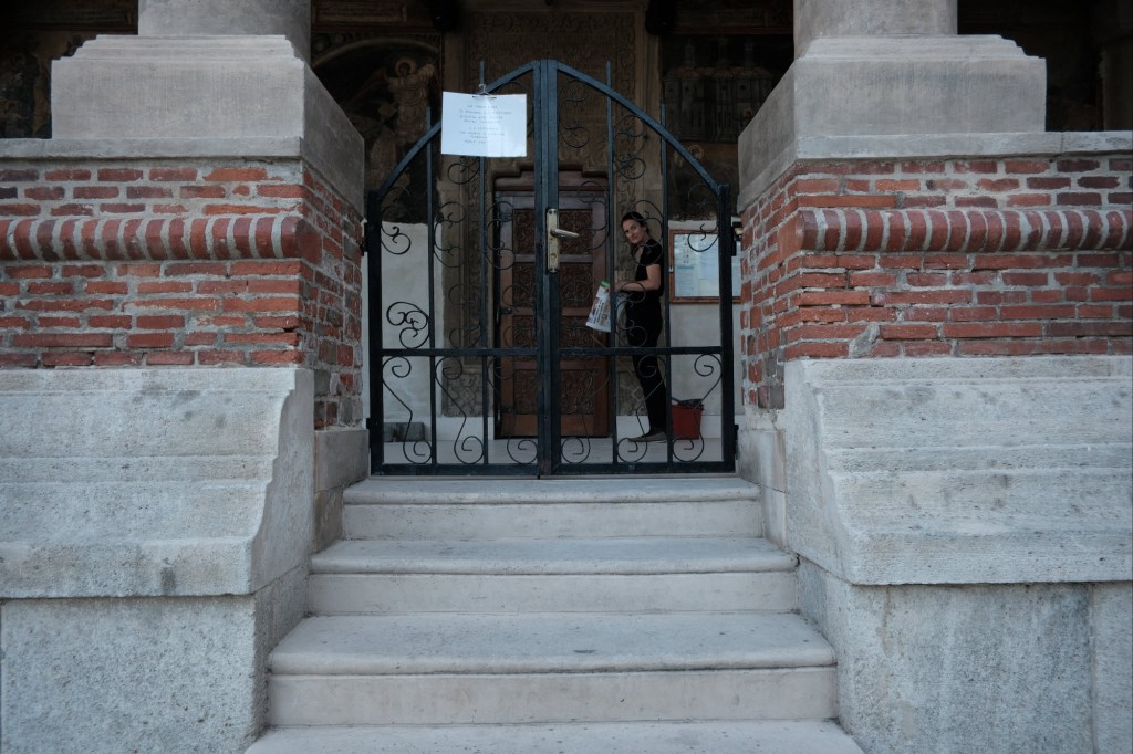 A woman waits outside a door at Kretzulescu Church in Bucharest, Romania.