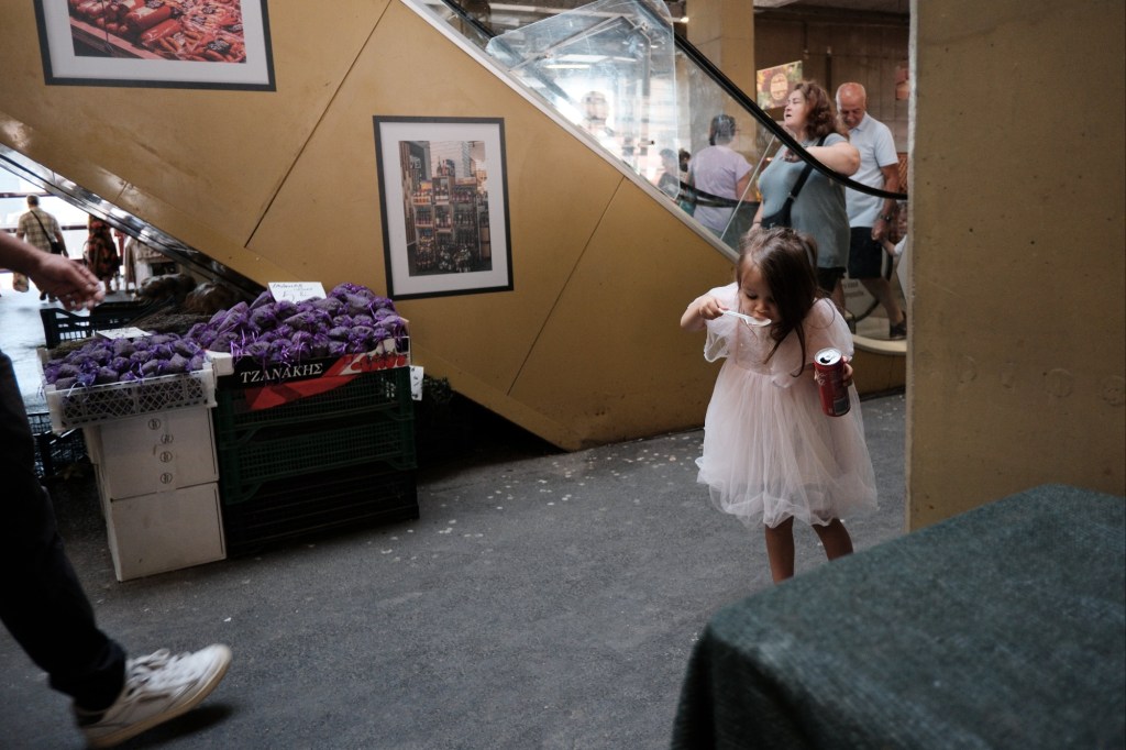 A girl drinking soda with a spoon at Obor Market in Bucharest, Romania.
