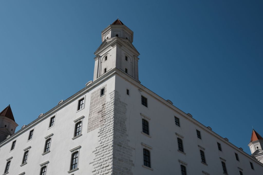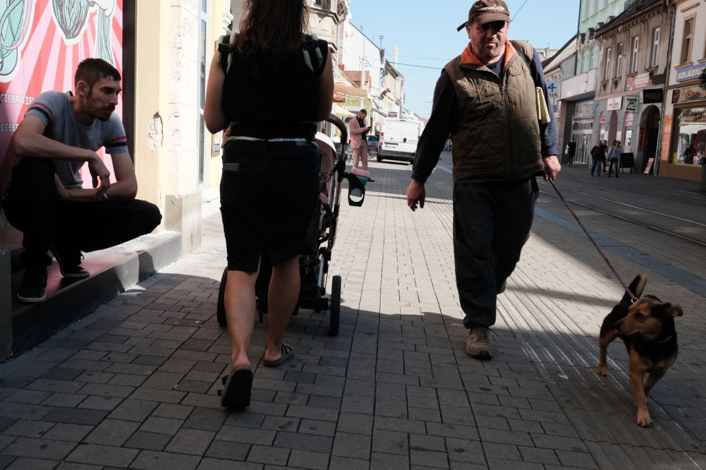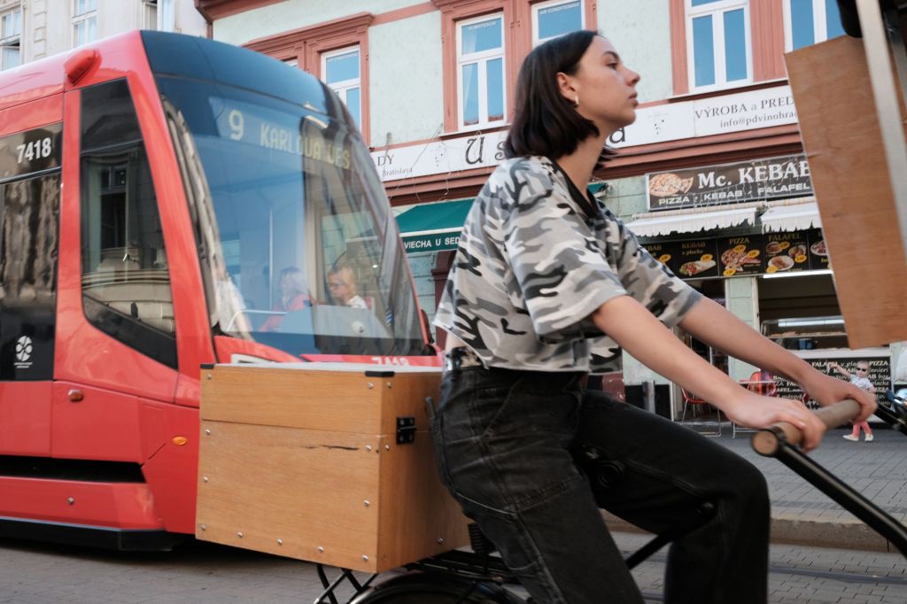 A girl pedals her cart past a tram in Bratislava, Slovakia.