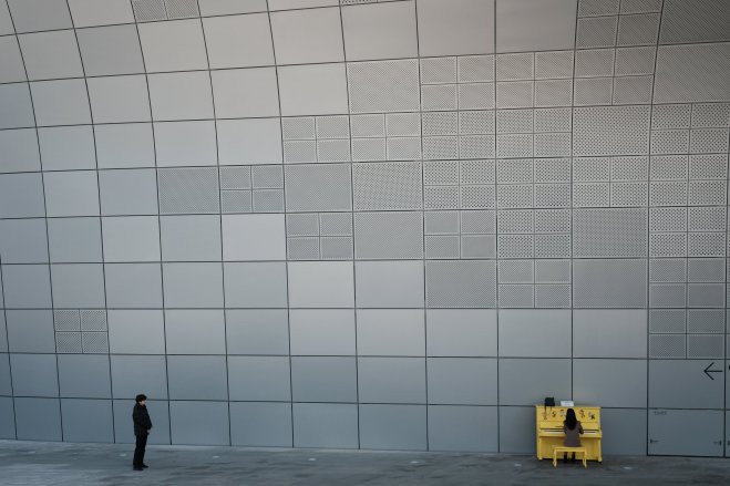 A piano player and a listener, Seoul, South Korea A woman plays the piano as a passerby listens, at the Dongdaemun Design Plaza in Seoul, South Korea.