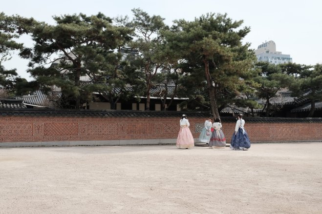Girls in hanbok, Seoul, South Korea Four girls in hanbok, traditional Korean dress, at Unhyeongung in Seoul, South Korea.