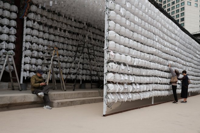 White lanterns, Seoul, South Korea Two women tying placards to white lanterns at Jogyesa temple in Seoul, South Korea.