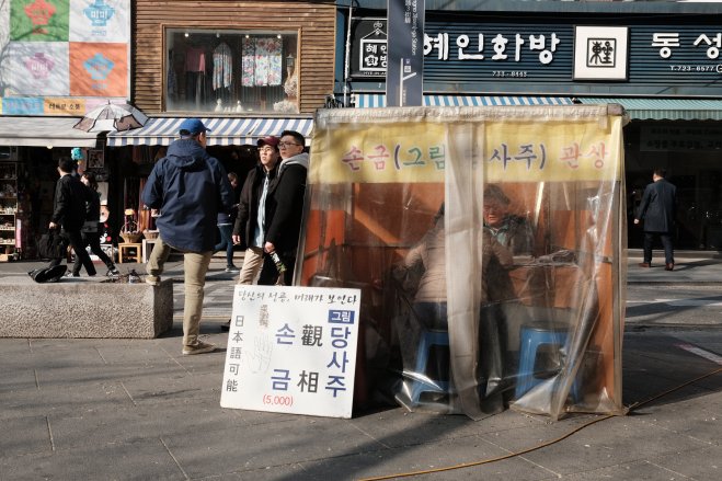 Palm reading booth, Seoul, South Korea A palm reader in a booth along Isadonggil in Seoul, South Korea.