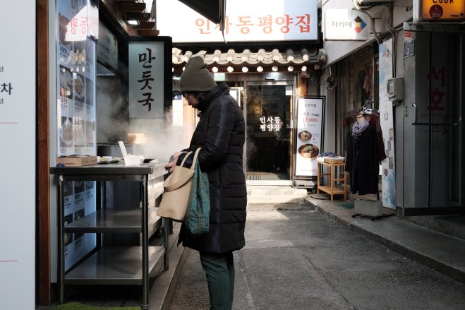 Woman with steamed dumplings, Seoul, South Korea A woman with steamed dumplings on an Insadong side street in Seoul, South Korea.