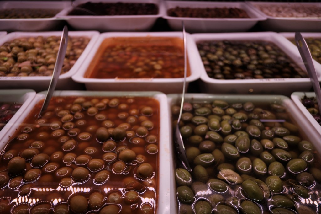Trays of olives at Mercat de Santa Caterina in Barcelona, Spain.