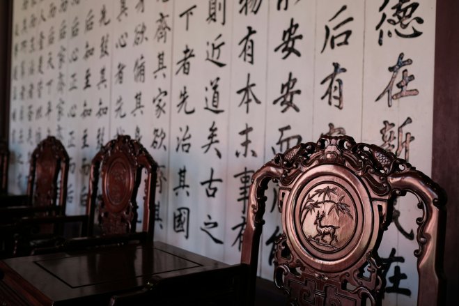 Chairs and calligraphy, Tainan, Taiwan Chairs in front of a wall decorated with calligraphy at the Confucius Temple in Tainan, Taiwan.