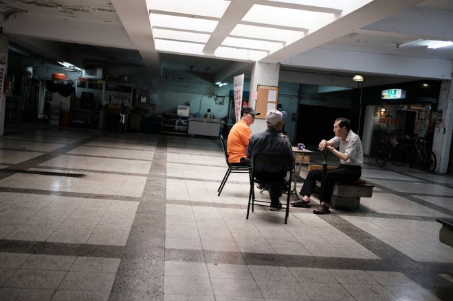 Three men in empty mall, Taipei, Taiwan Three men having a discussion in an empty mall, in Taipei, Taiwan.