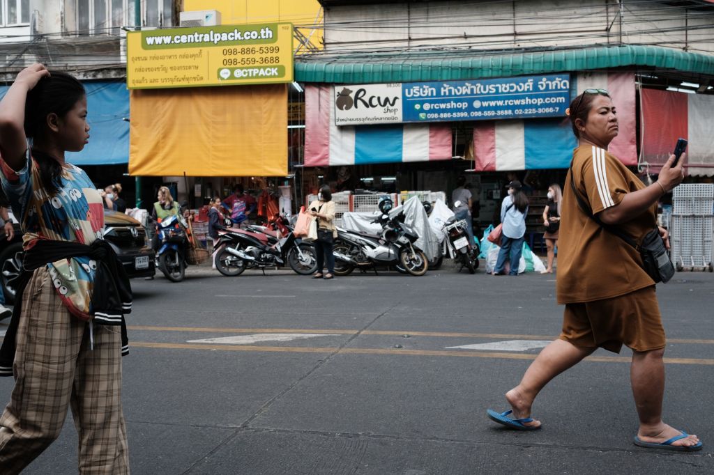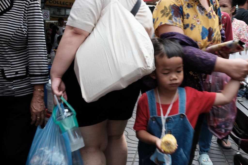 A man picking up a water bottle and other people in Bangkok, Thailand.