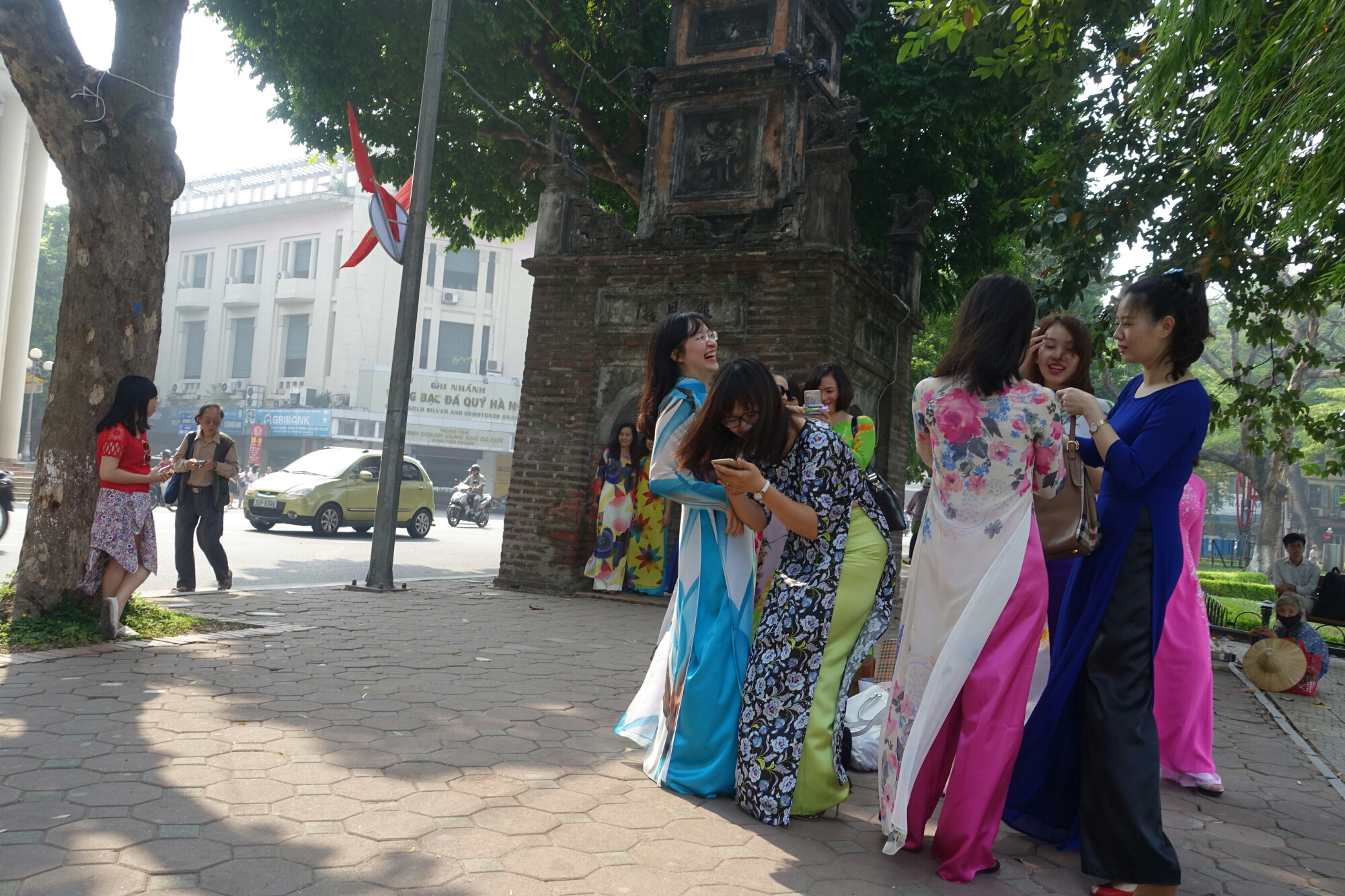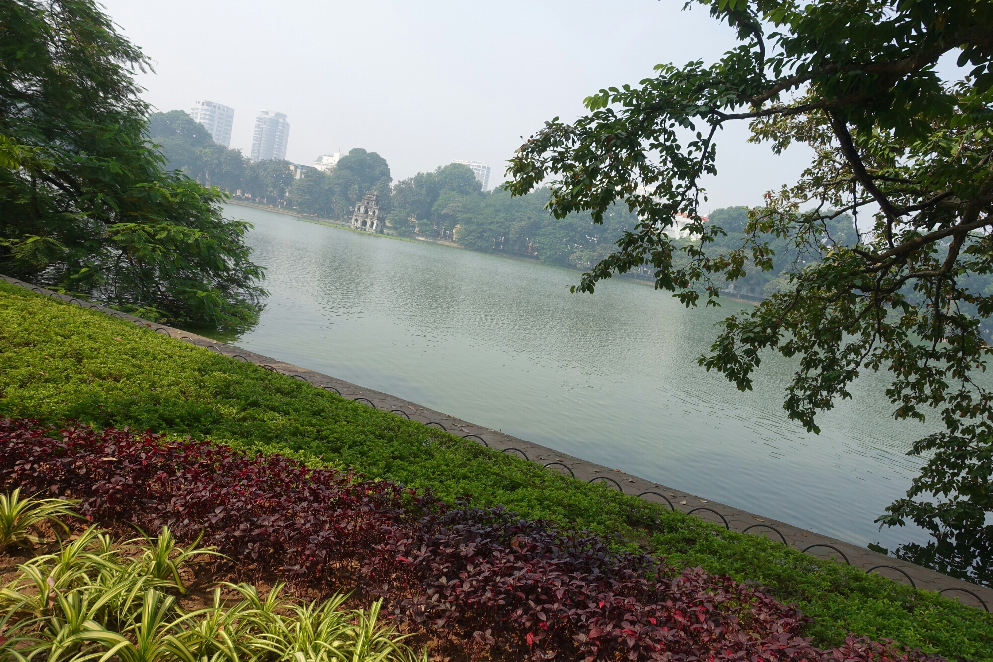 In the heart of Hanoi, Vietnam, is Hoan Kiem Lake with its signature red The Huc Bridge, tree branches dipping into its waters, and a pathway encircling its shores.