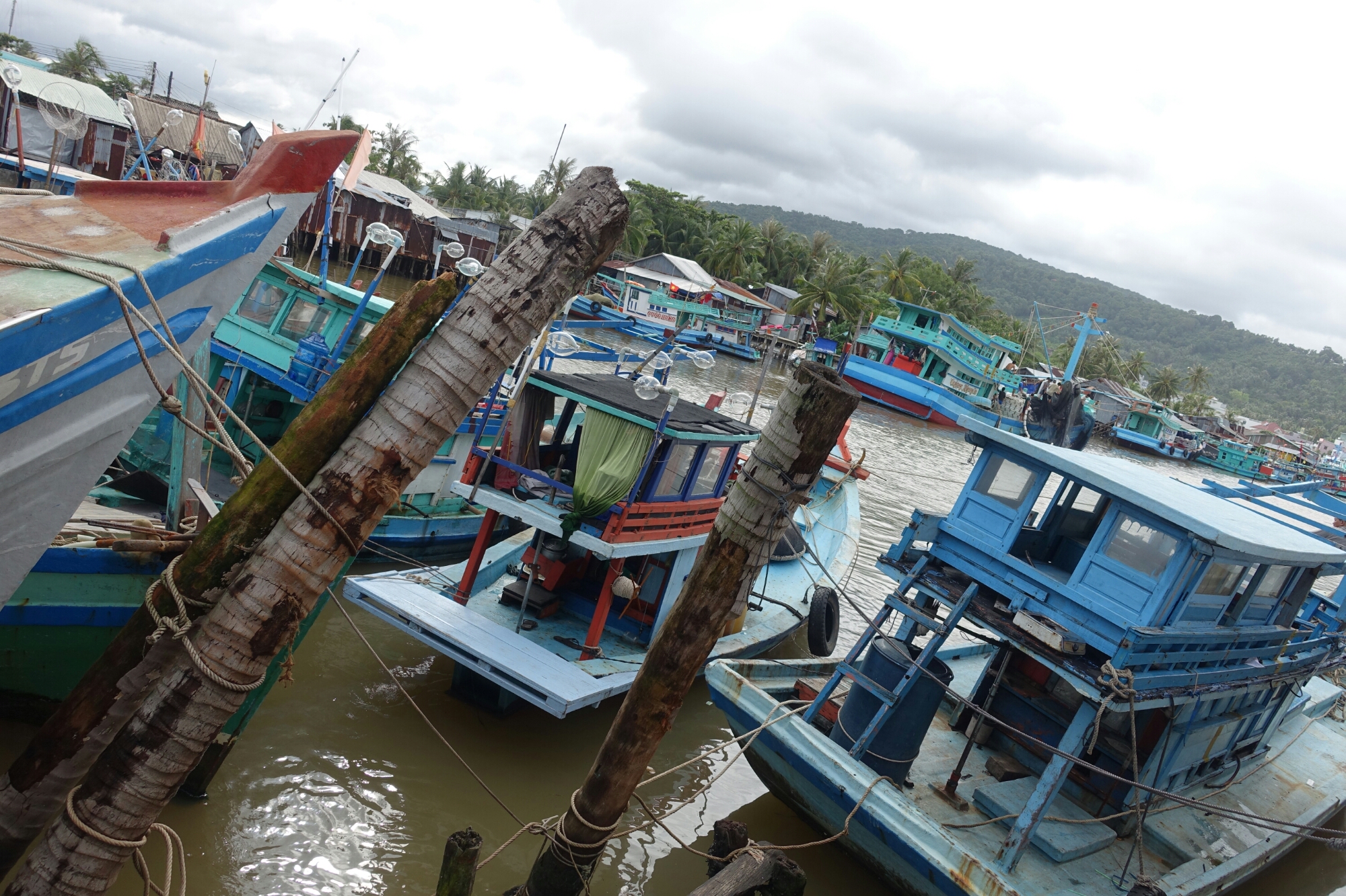 Duong Dong harbor on Phu Quoc Island, Vietnam, is jam packed with fishing boats docked side by side next to each other, and in front and back of one another.