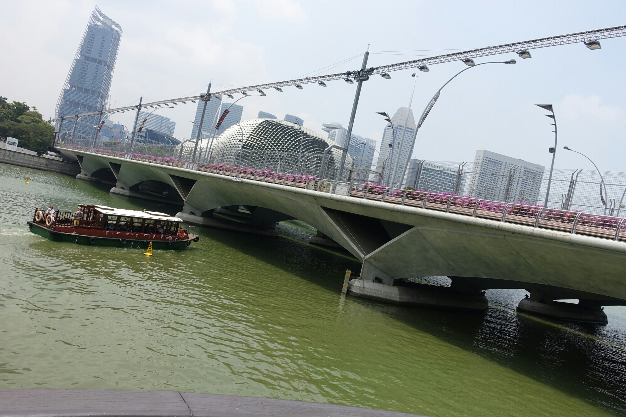 A water taxi heads underneath the Esplanade Bridge with the Esplanade Theaters in the background (though I like to call them the “Durian Buildings”) in Singapore.