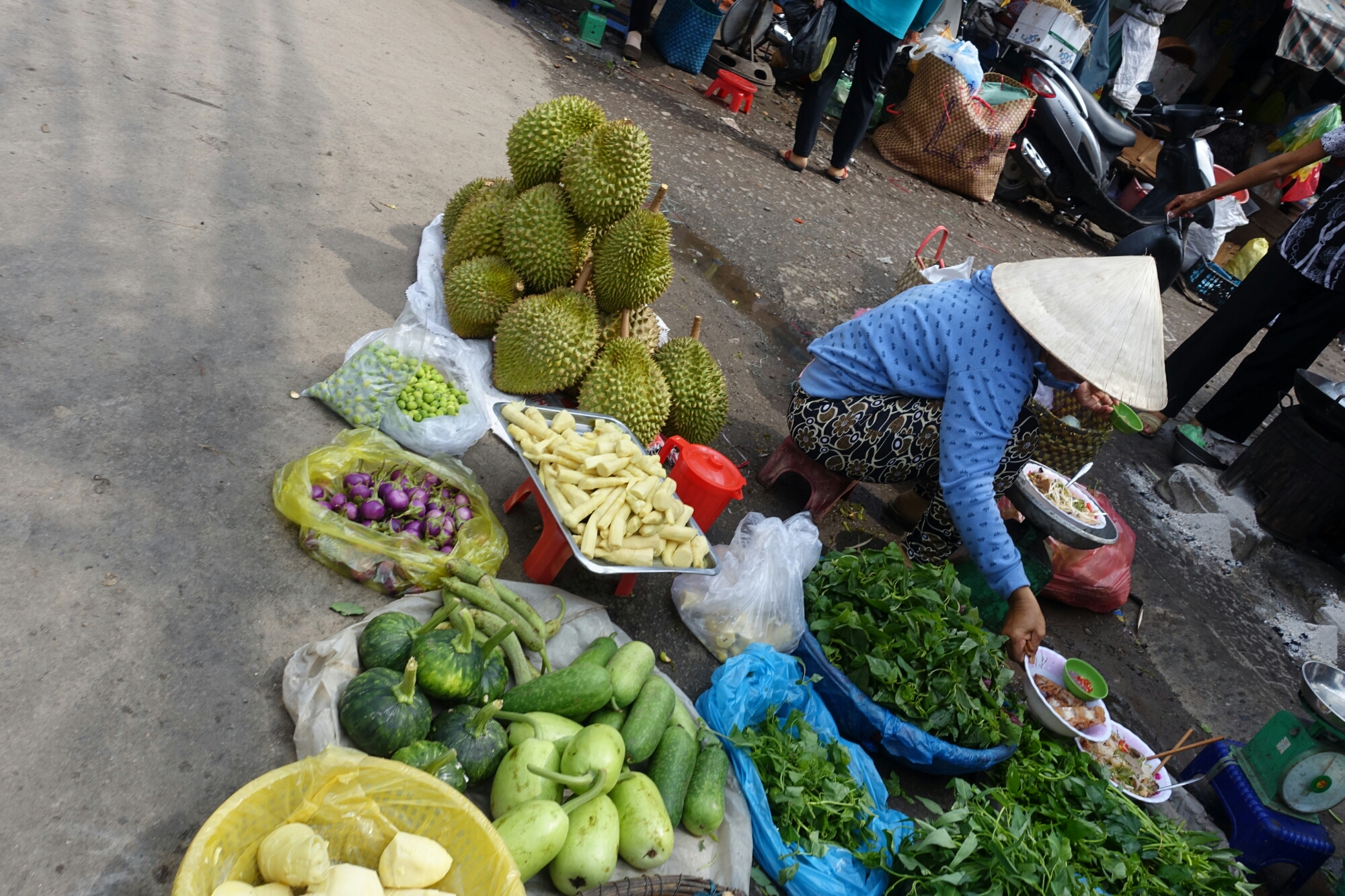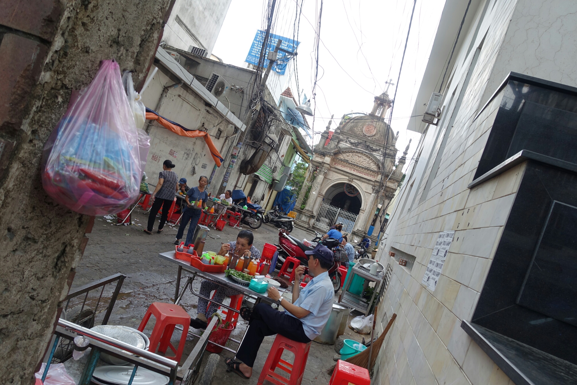 While there are street kitchens in just about every alleyway in the Cho Lon district of Ho Chi Minh City, Vietnam, the old church in the back makes this one a little different.
