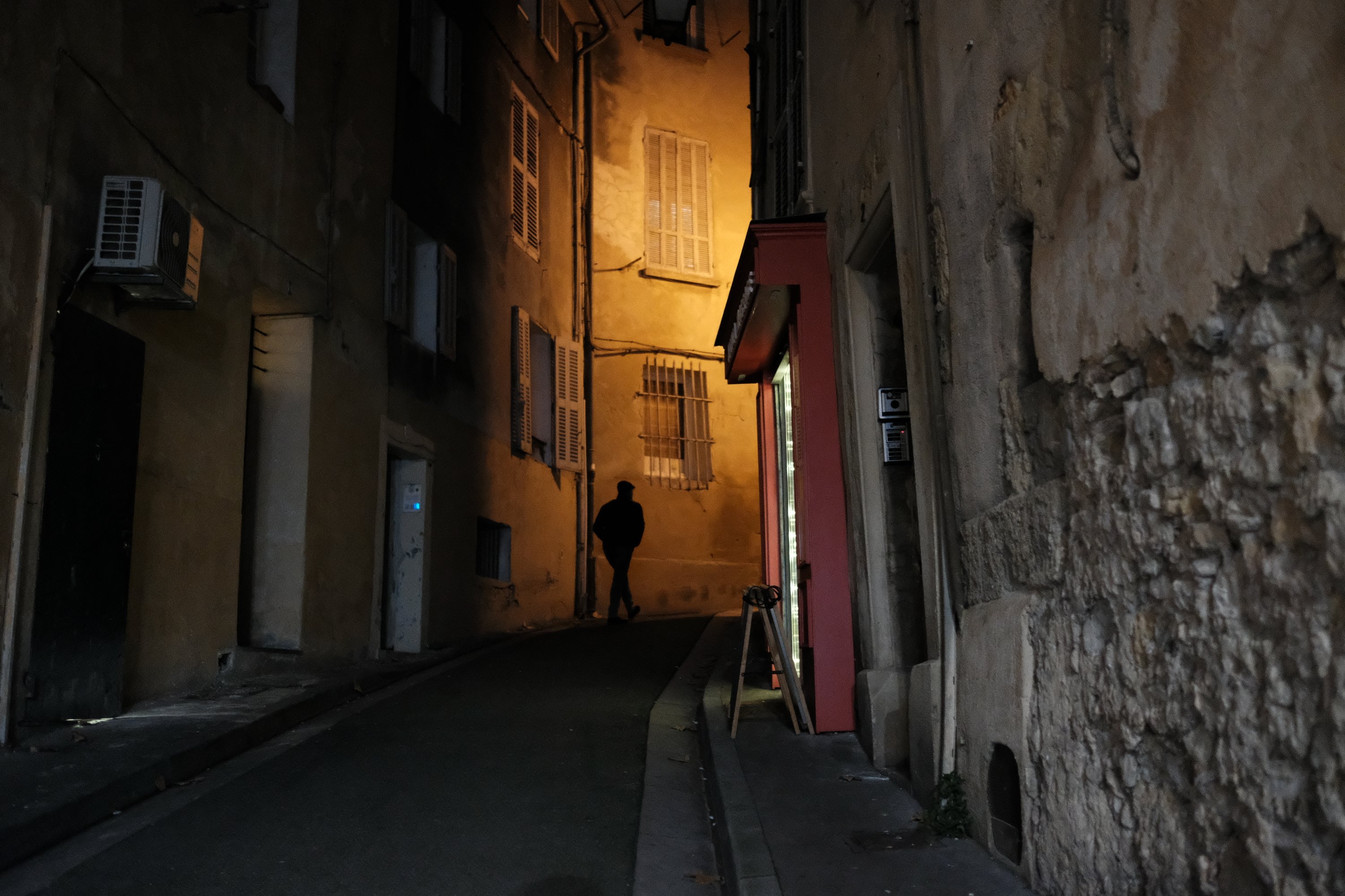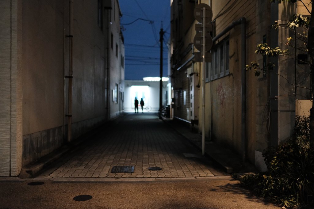 A man walks by an alley in Kōchi, Japan.