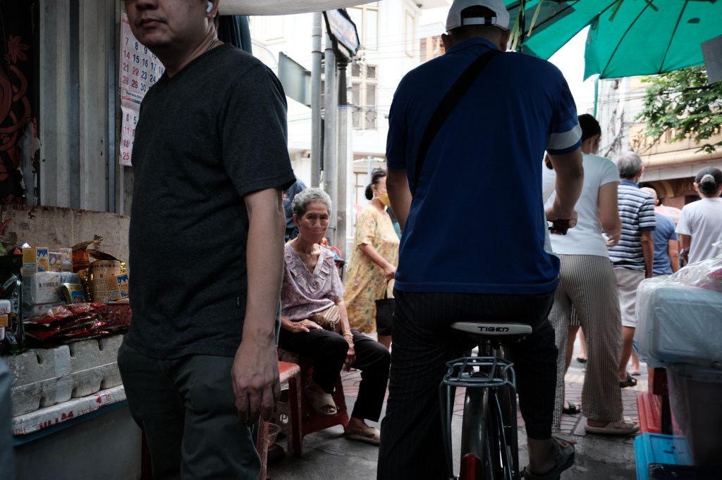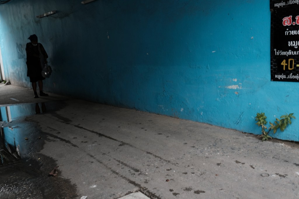 A lady sitting in an alley in Bangkok, Thailand.