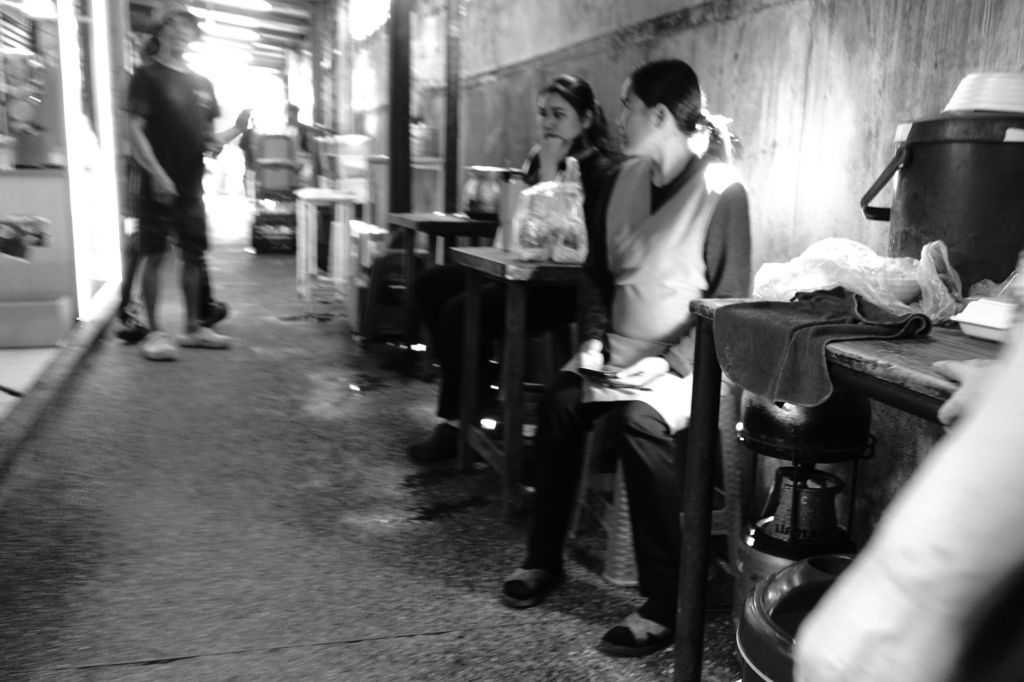 People talking in an alley in Bangkok, Thailand.