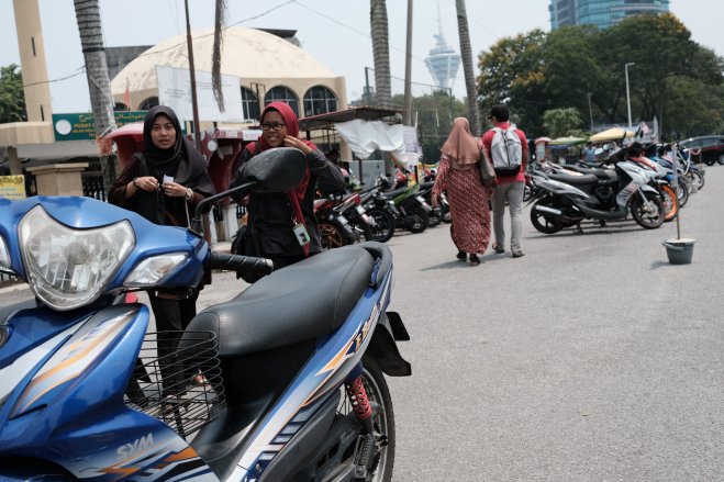 Two girls and their motorbike, Alor Setar, Malaysia Two girls walking to their motorbike parked in Alor Setar, Malaysia.